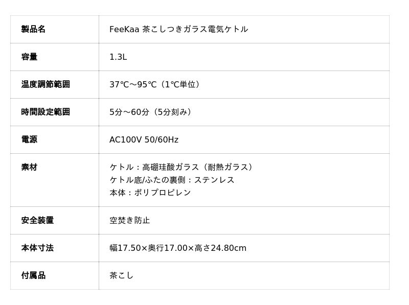 FeeKaa(フィカー)多機能ガラス電気ケトルは、1.3Lの大容量でありながら、コンパクトな設計を実現しています。NTC温度センサーにより、1℃単位の温度調節が可能です。最長72時間の保温機能を備えています。付属の茶こしを使用すれば、紅茶ポットや麦茶ポットとしてもご活用いただけます。忙しい日常において、いつでも最適な温度のお湯を出します。