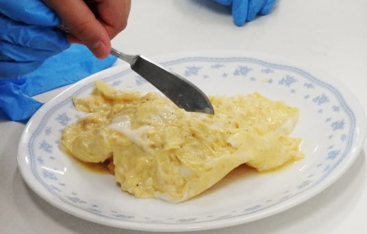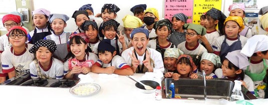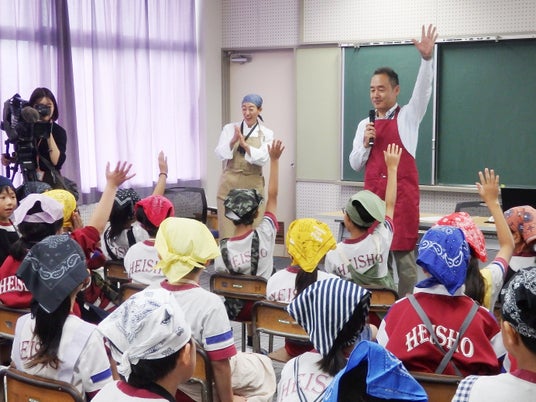 オムライスづくりでは、「これ、19センチのフライパンは私の。今日は東京から持ってきました。オムレツづくりには一番使いやすいの」と愛用のフライパンを披露。児童がバターを入れ、温まったフライパンに卵を割って素早く3回かき回し、オムレツが出来上がると、その手早さを目の前でみていた児童たちから「おーすごい」と歓声が上がった。