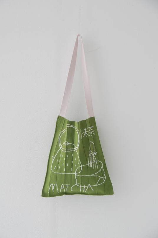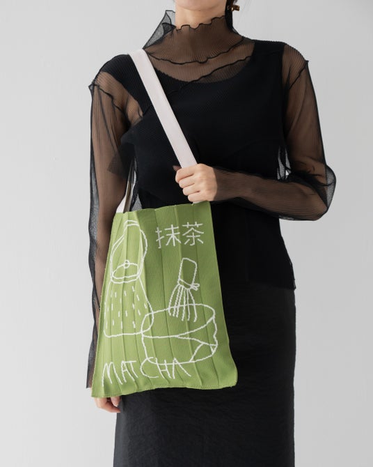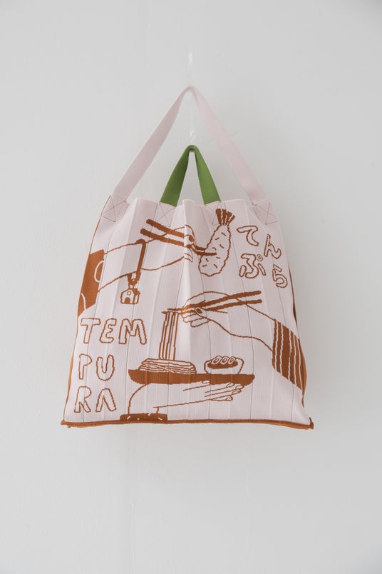 今回のコラボレーションでは、Laura Avivarが「抹茶」「コーヒー」「天ぷら」をモチーフに描いた作品が登場。シンプルでありながら温かみのあるタッチのイラストを、「Knitty」「Mam」の編地で表現しました。