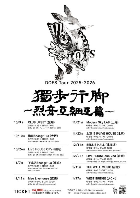ロックバンド『DOES』ワンマンツアーその名も"独歩行脚~烈音亜細亜篇~"ツアー初日に未公開だった追加5公演を発表。DOES初のワンマンでのアジア公演。