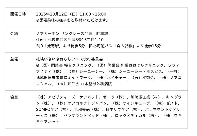 一般社団法人 地域医療未来創造ネットワーク(本社:東京都港区、代表理事:梅村将成)は、北海道札幌市にて「さっぽろいきいき暮らしフェス2025」を共同で開催します。