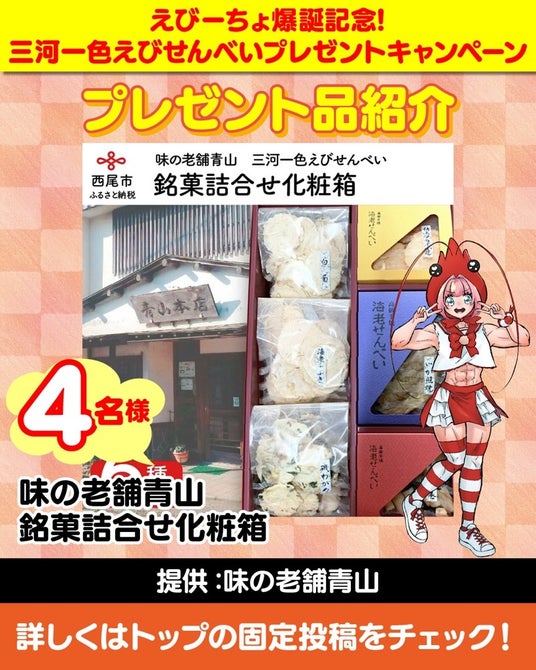 西尾市ふるさと納税応援アンバサダー第三のキャラ「えびーちょ」の誕生を記念して、特許庁の地域ブランド認定の「三河一色えびせんべい」を12名様へプレゼントするキャンペーンを開催中!