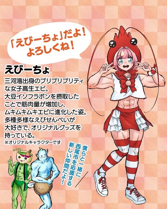 『えびーちょ』は、三河湾出身のプリプリプリティな女子高生エビで、大豆イソフラボンを摂取したことで筋肉量が増加し、ムキムキムキエビに進化したオリジナルキャラクター。多種多様なえびせんべいが大好きで、オリジナルグッズを持っており、『まーちょ』『うなーちょ』とともに西尾市ふるさと納税を盛り上げます!