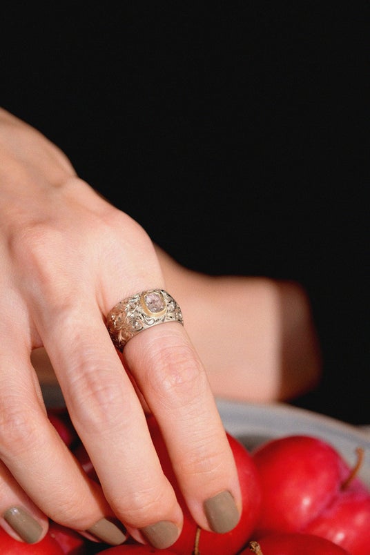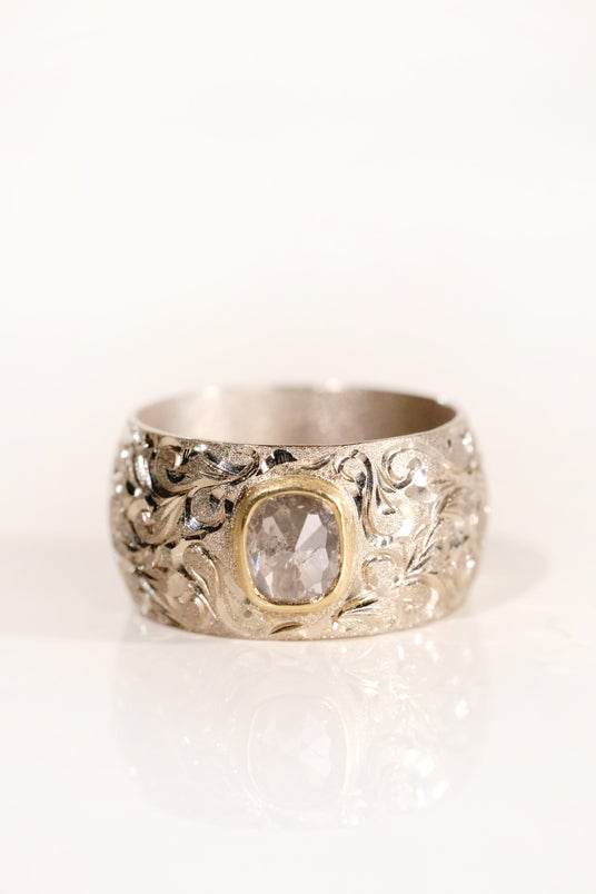 SIXTH NIGHT初のユニセックスリングとして制作された「Sign」は、宝石に沿って一点ずつ手巻きで成形し、熟練の職人による和彫りの装飾が施されます。