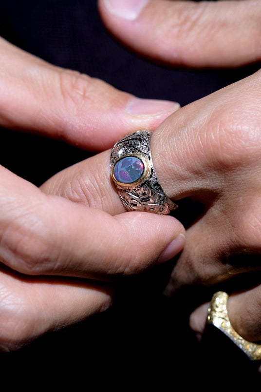 このデザインの原点は、デザイナーがパートナーのために制作した一本のリング。本人の誕生石であるオパールを中心に据え、周囲にはアラベスク文様とイニシャルをあしらいました。