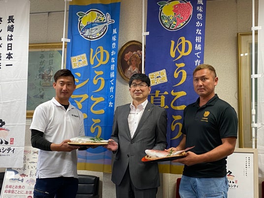 (左の方)昌陽水産長野社長(中の方)田上元長崎市長(右の方)雄昇水産西元社長