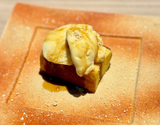 長崎カステラを表面はカリカリと中はプリンのような食感に仕上げた魅惑の夜のフレンチトーストです。 あたたかいカステラフレンチトーストと冷たいバニラアイス、季節の果物のマリアージュをご堪能ください。
