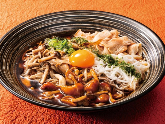 店舗で2時間以上かけてじっくり炊き出した自家製鶏がらスープがベースのそばつゆに、ごま油で香ばしく炒めて特製白だしで仕上げた4種のきのこ、店舗ですりおろすシャキシャキ食感の千切りとろろ、豚肉を合わせた食べ応えのある一品です。