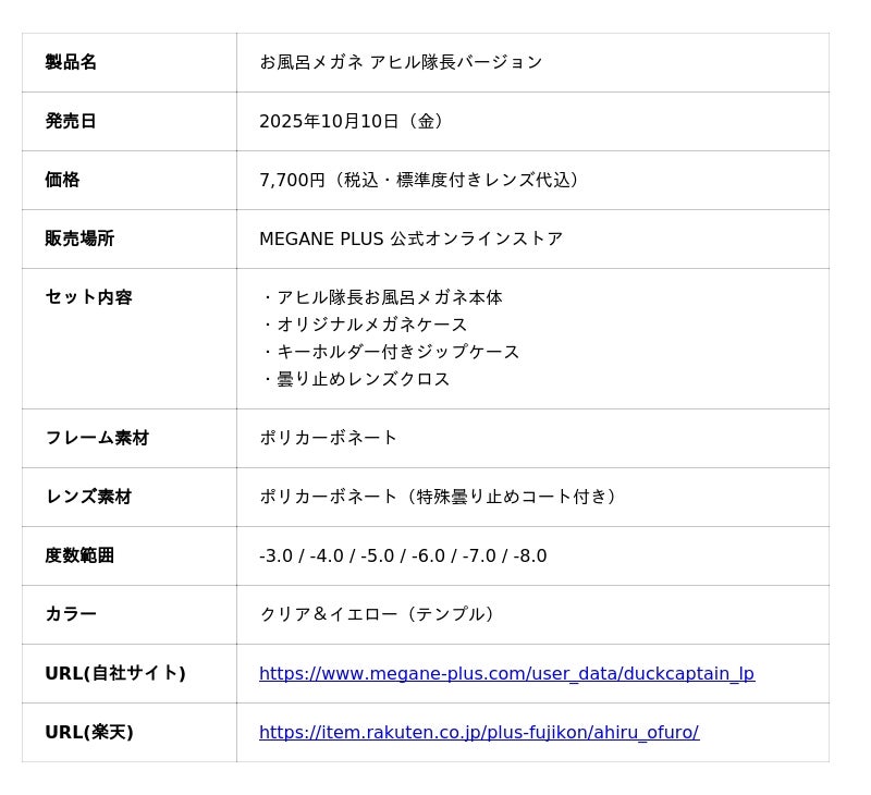 オンラインメガネショップ「MEGANE PLUS」を運営する株式会社FUJIKON HOLDINGS(所在地:福井県鯖江市、代表取締役:藤田徳之)は、株式会社パイロットコーポレーションの登録商標である「アヒル隊長」を起用した、業界初となるコラボレーション製品「お風呂メガネ アヒル隊長バージョン」を2025年10月10日(金)より公式オンラインストアにて発売します。本製品は、視力矯正が必要な人々が抱える「入浴時の見えない不便」を解消するために開発されました。金属部品を一切使用せず錆びる心配がないほか、特殊な曇り止めコートレンズにより、湯気の中でもクリアな視界を確保します。今回のコラボレーション限定のオリジナル付属品をセットにし、機能性だけでなく、お風呂時間の楽しさを演出し、新たな顧客層へ「お風呂メガネ」という選択肢を提案するものです。