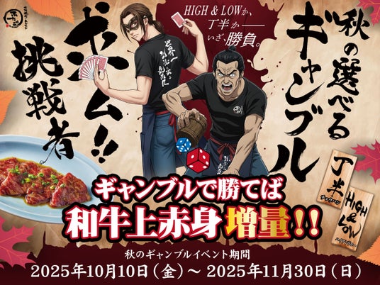 今年の秋の「焼肉ふたご」は、人気メニュー「和牛上赤身」を大盤振る舞い!ご注文いただいた全てのお客さまは「HIGH&LOW」か「丁半」からお好きなゲームを選び挑戦できます。勝つ度にどんどん増量し、枚数に制限はありません!負けたら勝ち分がなくなってしまうので、やめ時もお客さまの運次第!▶販売期間