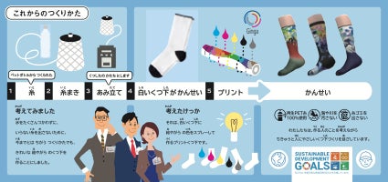 POPUPで展開する商品は、レンフロ・ジャパン株式会社が日本の靴下工場に所有する『GINGA』にて日本国内生産されています。『GINGA』は独自開発のらせん状プリント6色インクの使用により、生産速度と色の再現性の向上を実現した靴下専用のプリンターです。