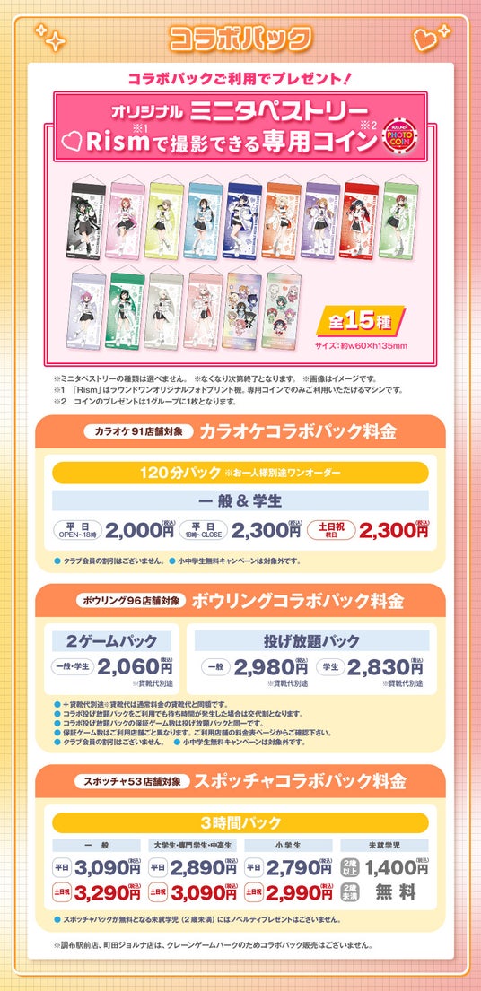 コラボルーム、コラボパックをご利用いただいた方1名様ごとにオリジナルミニタペストリー(全15種)をランダムで1枚とラウンドワンオリジナルプリント機「Rism」にて使用できるフォトコインを1枚プレゼント!