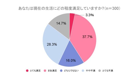 「現在の生活にどの程度満足していますか?」(n=300)という質問に対して、満足層(「とても満足」+「まあ満足」)は41.0%にとどまりました。内訳は「とても満足」が3.3%、「まあ満足」が37.7%です。