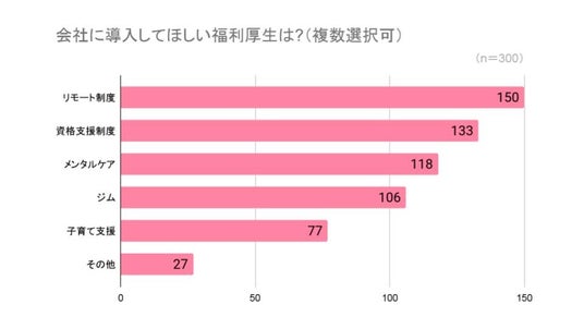 「会社に導入してほしい福利厚生は?(複数選択可)」(n=300)という質問に対して、「リモート制度」が150件で最も多く、次いで「資格取得支援」が133件、「メンタルケア」が118件という結果でした。
