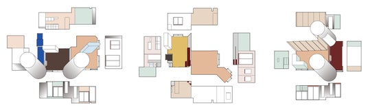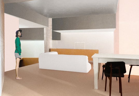 展開ドローイングでインテリアを検討し、幾何学的仮説に基づいて色彩を決定しています。対角に色を配し、見返すと同じ色が見えます。断片化した空間が像を結び広がりが生まれます。