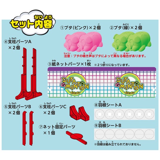 「ブタミントン」は、ブタ型のマスコットをラケットとして使用し、バドミントンのように羽根をネット越しで落とさないように飛ばし合う、スポーツ系アクションゲームです。ラケットのブタは、ボディを押すと鼻息(鼻から空気)が出て、その風力で羽根を飛ばすことができます。ポリエチレン素材の羽根は軽く、丸い形状ですので、空気にあたると角度と強さによって思いもよらない動きで飛び交います。ブタ(ラケット)は4個入りで、1対1はもちろん2名対戦によるダブルスも可能です。