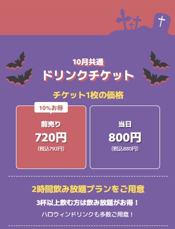 キラキラドリンクやゴーストをイメージしたSNS映えドリンクを飲み放題で提供します。また、秋にぴったりのクラフトビールも豊富にご用意。仮装で来場された方限定で【ドリンク半額キャンペーン】も実施します。※クラフトビールは飲み放題対象外