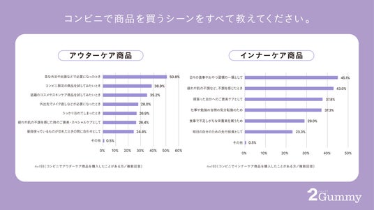 「コンビニ美容」のシーンも大きく進化しています。「あなたがコンビニでアウターケア商品を購入するのは、どのようなシーンですか」といった問いに対して、「急な外泊や出張などで必要になったとき」が50.8%で従来の“レスキュー需要”は根強いものの、「コンビニ限定の商品を試してみたいとき」(38.9%)や「話題のコスメやスキンケア商品を試してみたいとき」(35.2%)といった「トレンドを試す」という目的が上位に迫っています。インナーケア商品を購入するシーンでは、1位が「日々の食事やおやつ習慣の一環として」で45.1%、次いで「疲れや肌の不調など、不調を感じたとき」が2位で43.0%、3位が「頑張った自分へのご褒美ケアとして」で37.8%になりました。インナーケア商品が、不調時のケアだけではなく日常の習慣やご褒美ケアとして取り入れられている様子が分かります。