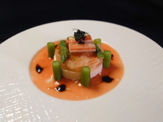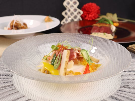 船内または陸上、それぞれの厨房から運ばれる料理の数々。一皿ずつ、丁寧に盛り付けられたフレンチ。昨年からできるだけ国産のものを使用し、日本郵船が包括連携協定を結ぶ「秋田県」と「北海道」の食材を積極的に取り入れております。