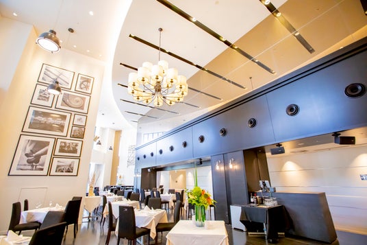 ゆとりの120分:運河沿いの解放的かつ、高い天井とスタイリッシュなレストランで、本格フレンチフルコースをご提供します。