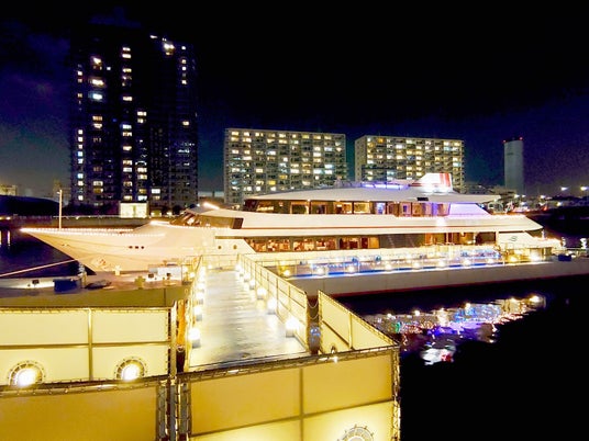 ライトアップされた桟橋に停泊する「LADY CRYSTAL」(レディ クリスタル)