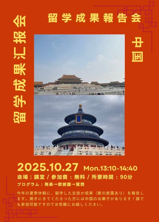 島根県立大学(浜田キャンパス)では、2025年10月27日(月)に、中国留学成果報告会を開催します。本報告会は、中国に留学した学生が現地での学びや生活、人との交流について発表し、参加者に中国の“今”を身近に感じてもらうことを目的としています。また、中国語の歌やビンゴゲームなどを通じて、楽しみながら中国への理解を深め、日中友好の架け橋となる場をつくります。