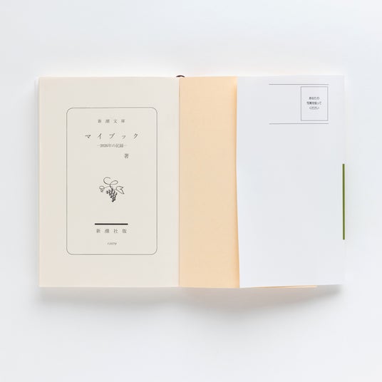 カバー&本体表紙をめくると「本扉」と呼ばれるページがあります。新潮文庫のシンボル、ぶどうのマークの上にある著者名欄は空白になっています。なぜなら著者は「あなた」だから。まずはここにお名前をお書きください。カバーをとった本体の表紙も同様のデザインになっていますので、こちらにもご記名を。