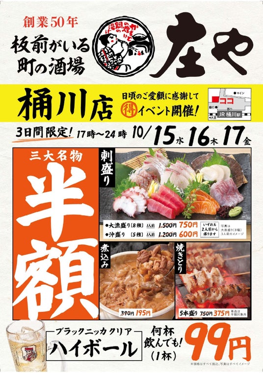 【桶川『庄や』で半額セール!!】10/15(水)から10/17(金)の3日間限定で直送鮮魚の刺身盛りに焼き鳥、もつ煮込みも超特価