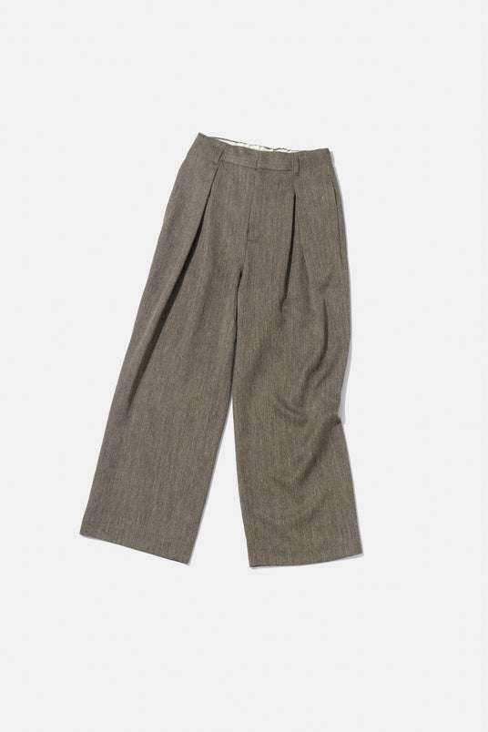 ウールのツイードのような奥行きのある素材が季節感を薫らせるワイドパンツ。打ち合わせになるように入ったタックのデザインが着こなしのアクセントになります。楽な着心地が魅力のバックゴム仕様。きちんと見えするルックスはオンオフ問わず幅広いシーンで着用でき、装いに秋の雰囲気をプラスしてくれます。秋冬のクラシックなムードを楽しみながら、着心地の良さとお手入れのしやすさを叶えた手洗い可能な生地です。