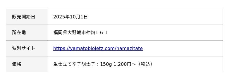 株式会社ヤマトバイオレッツ(本社:福岡県大野城市/ふくやグループ/代表取締役:梁川 剛一、以下 当社)は、製造全工程において一切冷凍処理を行わない「生仕立て辛子明太子」の通信販売を、2025年10月1日より開始いたしました。
