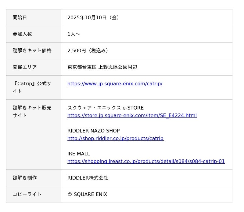 株式会社スクウェア・エニックス(本社:東京都新宿区、代表取締役社長:桐生 隆司、以下スクウェア・エニックス)は、新たな観光周遊型コンテンツ『Catrip』(キャトリップ)を本日(10/10)より開始いたします。