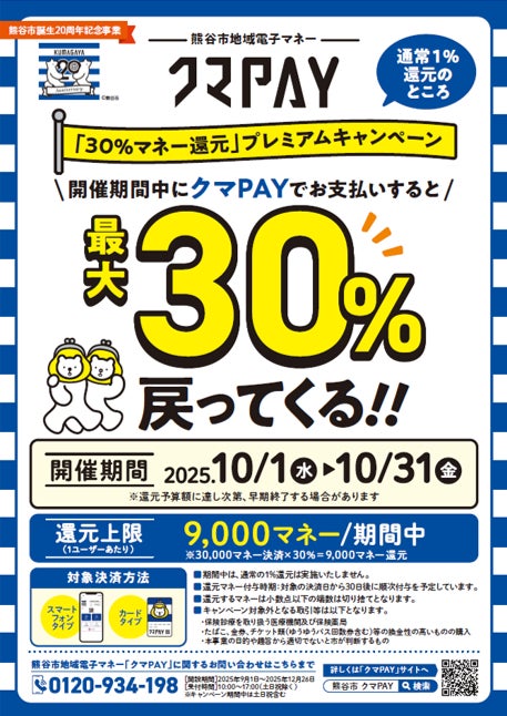 かねてよりお客様の利便性向上のため、地域電子マネー「クマPAY」を導入しておりましたが、この度、熊谷市が地域経済の活性化を目的として実施する「クマPAY『30パーセントマネー還元』プレミアムキャンペーン」の対象店舗となりましたことを、改めてお知らせいたします。