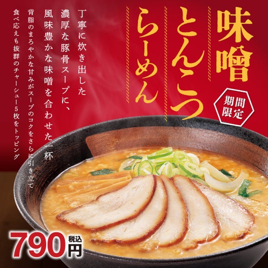 株式会社幸楽苑(本社:福島県郡山市)が運営する「幸楽苑」は、2025年10月15日(水)から、豚ガラを丁寧に炊き出したスープに昆布・椎茸・煮干しを加えた、味噌と豚骨スープの濃厚な旨みが味わえる「味噌とんこつらーめん」790円(税込)を期間限定販売いたします。本商品には、70円~150円お得なセットをそれぞれご用意しております。
