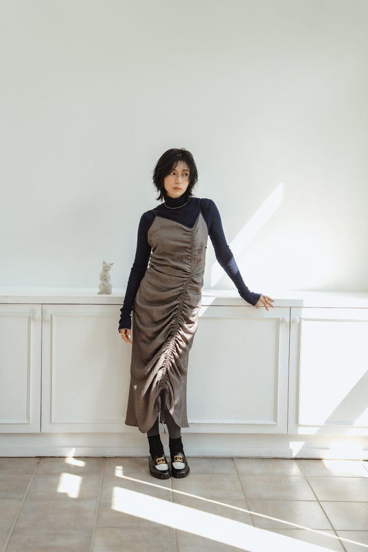 [SET] シルクリブタートルトップス ( Classic Navy )+アシンメトリーギャザーキャミソールワンピース ( Khaki Gray )