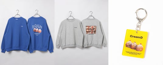 千葉県船橋市の自家製クリームが自慢の生ドーナツ専門店「Cream D」の商品をプリントした親子で着られるスウェットやチャームをご用意。