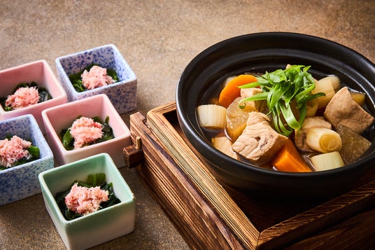 【日本料理】鮪と葱を主役に、醤油、酒、だしでじっくりと煮込む、江戸時代から伝わる鍋料理「ねぎま鍋」をご用意いたします。鮪と、とろりとした甘みを引き出した葱の相性がよく、心も体も温まる滋味深い味わいをご堪能ください。旨み豊かな蟹とほうれん草をさっぱりと仕上げた上品なお浸しや、おすすめの旬の貝を使用した特製“海鮮貝だし汁”で味わう「東京野菜と仔羊のしゃぶしゃぶ」、シェフがその場で調理パフォーマンスを繰り広げる揚げたての「天麩羅」をお楽しみください。