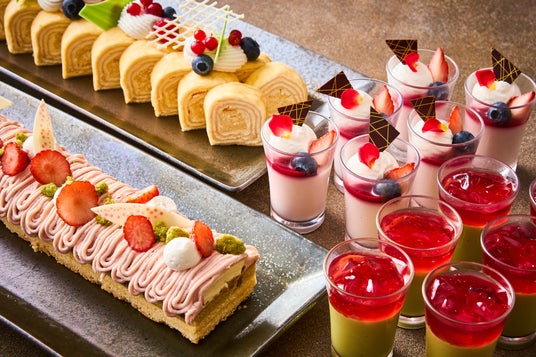 ピスタチオのコクを味わえるパンナコッタ、やさしい甘さが重なるミルクレープロールケーキ、そして爽やかな苺で仕上げた杏仁豆腐をご用意いたします。ディナータイムには限定スイーツとして「苺のモンブラン」が登場。ナッツが香ばしいビスキュイ生地にオレンジババロアを重ね、その上からたっぷりと苺のディプロマットクリームを絞りました。お食事の締めくくりには、華やかで贅沢なデザートの数々をぜひご堪能ください。