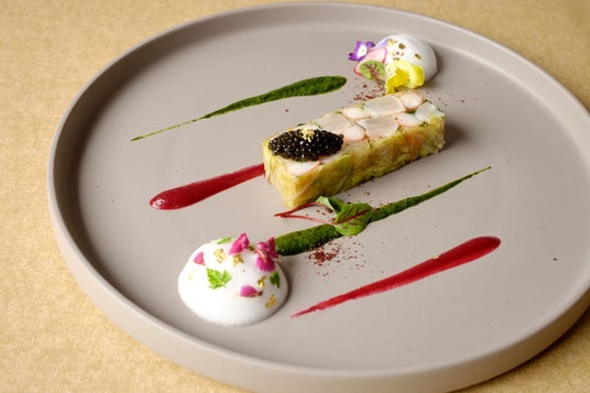 ズワイガニと真鯛のテリーヌ ~トマトのスノードーム キャビア添え~