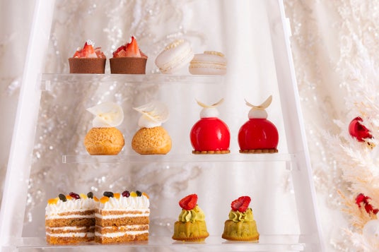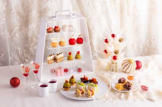 真っ白なスタンド上には、濃厚なディプロマットクリームに、みずみずしいフレッシュの苺を贅沢にあしらい、ほのかに花の香りをまとうライチのジュレが優雅な余韻を添える「苺とライチのクリスマスタルト」や、 貴婦人の帽子をイメージしたチョコレート細工が目を引く、カラマンシーの爽やかな酸味がアクセントの「シュー・カラマンシー」、バニラビーンズの芳醇な香りが広がるチーズムースの中に、甘酸っぱいブラックベリーのコンフィチュールを閉じ込めた「マスカルポーネとブラックベリーのオーナメントムース」など、華やかなスイーツが勢ぞろいします。