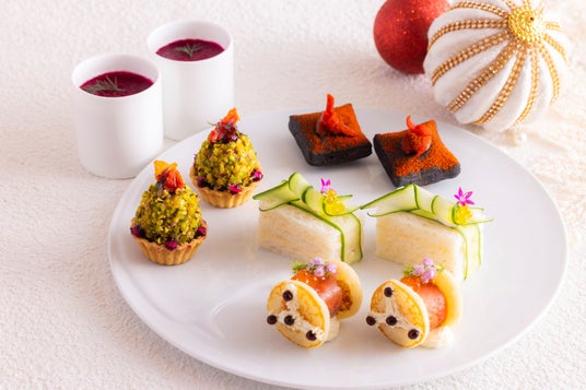 5種類のセイヴォリーには、濃厚なゴートチーズにピスタチオを和え、クリスマスツリーに見立てたテリーヌに、チーズのコクを引き立てる赤ワインと甘酸っぱいクランベリーで仕立てたジュレを重ねた「ゴートチーズのクリスマスツリーテリーヌ」や、じっくり火入れをしたチキンをサンドし、胡瓜のリボンでクリスマスギフトのように仕上げた「ポーチドチキンのクリスマスギフトサンドイッチ」、瀬戸内レモンの香りを纏ったクリームチーズをスモークサーモンで包み、ふんわりと焼き上げた小さなパンケーキのブリニとともにお召し上がりいただく「スモークサーモンのタルタル 瀬戸内レモンクリーム」など、シェフの技が光る繊細なセイヴォリーが揃います。