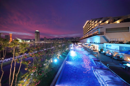 泡が噴き出すマッサージベッドや、半身浴をしながら移ろいゆく神戸港の景色が愉しめるアクアシートなど、絶景と光の都神戸の中心で、ここでしか体験できないリラックスしたひとときを過ごすことができる屋外温水プールです。