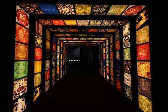 ステージ03の最後は、正倉院宝物の文様をじっくりと体感できる「美のアベニュー」。縦横45センチ四方に収められた文様が色鮮やかに並びます。
