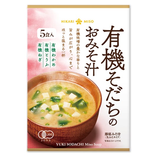 『有機そだちのおみそ汁』は丁寧に仕込み熟成させた有機白みそと赤みそを合わせ、やさしくなめらかな味わいに仕上げた生みそタイプの即席みそ汁です。味噌の原料である大豆や米、みそ汁の具材は、禁止された農薬や化学肥料を使わず自然の力を利用して栽培されている、有機JAS認証を受けた原料を使用しています。