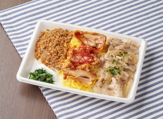 【内容】黒コショウのきいた塩だれ味の豚バラ炒め、甘辛いタレにまぶした鶏モモ揚げ、甘めのカレー風味の牛そぼろをごはんにのせた肉盛り弁当です。