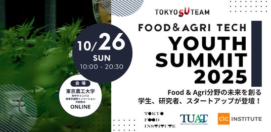 食の未来を考え、新しい事業構築・人材育成、さらには社会の多様なアクターの共創によるエコシステム構築を目指す一般社団法人TOKYO FOOD INSTITUTE(所在地:東京都中央区、代表理事:沢 俊和、以下「TFI」)と、政府・地方自治体・大学などと連携し、エコシステムの発展とイノベーションを通じた経済成長に貢献するCIC Institute(所在地:東京都港区、創業者兼CEO:ティム・ロウ)は、東京農工大学と協働し、2025年10月26日(日)、全国の大学生を対象に、食と農業の未来を担う起業家人材を発掘・育成することを目的として「FOOD&AGRI FOODTECH Youth Summit 2025」を初開催いたします。