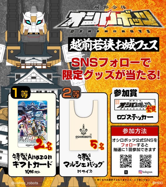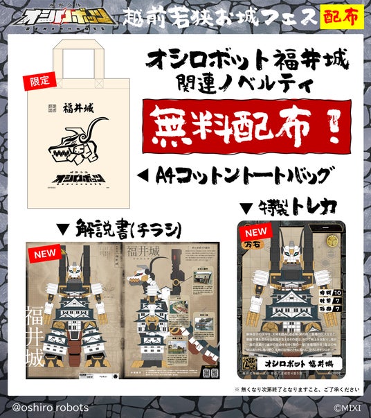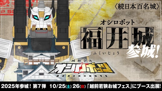 株式会社MIXI(東京都渋谷区、代表取締役社長 上級執行役員 CEO:木村 弘毅)は、MIXI_ANIMEオリジナルコンテンツ『城郭合体オシロボッツ』の22城目となる「オシロボット福井城」を本日公開しました。また、2025年10月25日(土)、26日(日)に開催される「越前若狭お城フェス」へブース出展します。ブースでは、オリジナル解説書・特製トレーディングカード・限定コットントートバッグの無料配布を実施するほか、オシロボット福井城の御城印など、関連グッズも販売予定です。