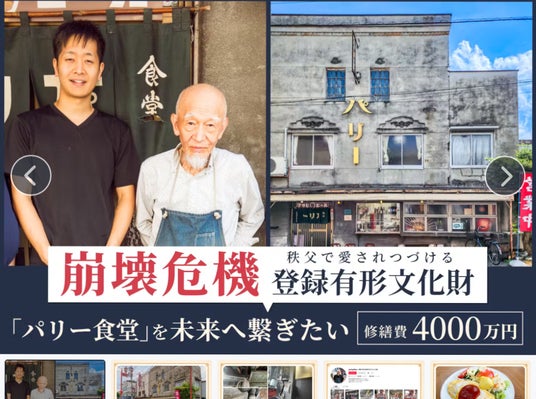 年間約 2 万人が来訪する秩父の老舗食堂「パリー」( 3 代目:川邉義友 82 歳・祖父、 4 代目:川邉晃希 30 歳・孫)は、存続の危機に瀕する国指定の登録有形文化財(築 98 年の建造物)を維持するため、耐震工事費 4,000 万円を募るべく、クラウドファンディングに挑戦します。