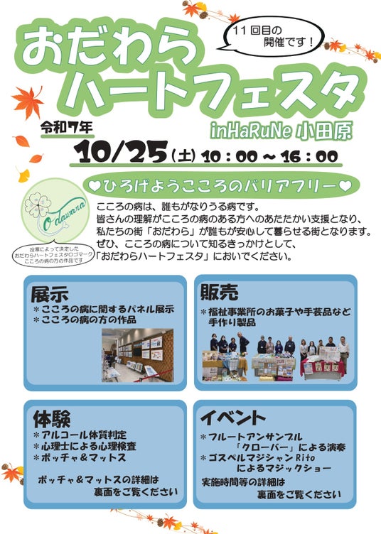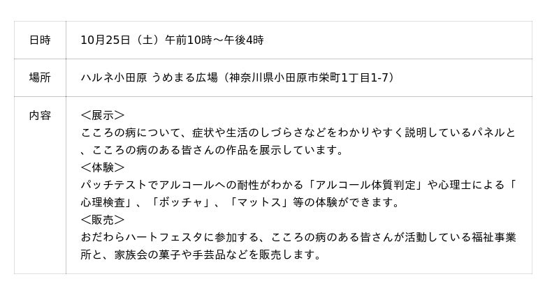 小田原市では、誰もがなり得る「こころの病」について知るきっかけとなることを目的に「ひろげようこころのバリアフリー」をテーマとした「おだわらハートフェスタ」を実施します。
