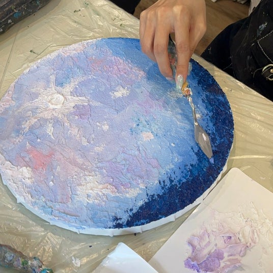 ペインティングナイフでモデリングペーストをのばし、立体的な“月”を描くアート体験として、アート初心者からデート・女子会利用まで幅広く注目を集めています。