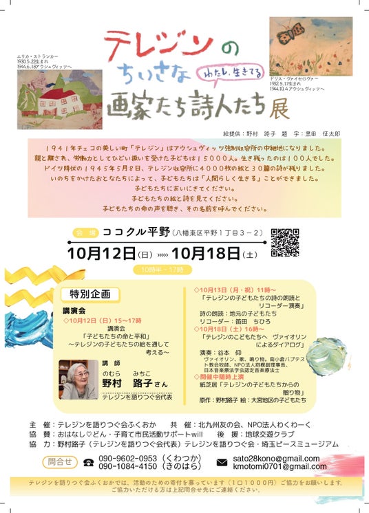 10月12日(日)より、北九州市八幡東区で多世代多様な方々の交流の場となっている、ココクル平野・くるくるスペースにて「テレジンのちいさな画家たち詩人たち展」を開催します。